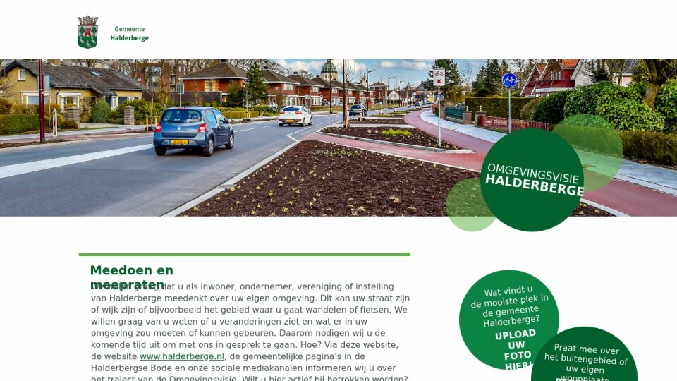 We willen graag dat u als inwoner, ondernemer, vereniging of instelling van Halderberge meedenkt over uw eigen omgeving. Dit kan uw straat zijn of wijk zijn of bijvoorbeeld het gebied waar u gaat wandelen of fietsen. We willen graag van u weten of u veranderingen ziet en wat er in uw omgeving zou moeten of kunnen gebeuren. Daarom nodigen wij u de komende tijd uit om met ons in gesprek te gaan. Hoe? Via deze website, de website www.halderberge.nl, de gemeentelijke pagina’s in de Halderbergse Bode en onze sociale mediakanalen informeren wij u over het traject van de Omgevingsvisie. Wilt u hier actief bij betrokken worden? Geef dit dan door via het contactformulier, via het mailadres gemeente@halderberge.nl of via 140165.